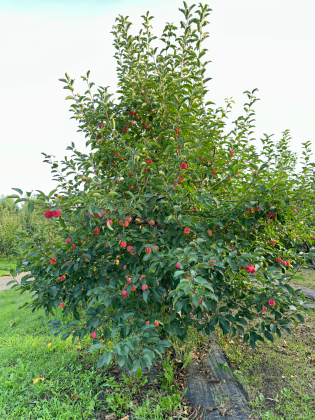 鲜食、加工类型品种。果实成熟期9月下旬。终花期到果实成熟期129天。果实贮藏性120天。树形分枝型,树姿开张,树势中。花蕾粉红,花瓣长圆形,无重瓣,成枝力强。连续结果能力强。生理落果轻,采前落果程度轻。果实扁圆形,果色红色,部分着色,片状。果实成熟时果面有蜡质,有果粉,平滑,无棱起。果点小,密度密,心室占整个果实小。果肉淡黄色,质地硬,汁液中,风味酸甜。香气淡,无异味。果实横径5.16厘米,纵径3.63厘米。可溶性固形物含量14.80%,可滴定酸含量0.51克/一百克,平均单果重52.45克,果肉硬度12.84千克/平方厘米。抗腐烂病,抗黑星病。抗寒。2023-2024年进行适应性试验,第1生长周期亩产1662.49千克,比对照龙丰增产7.69%;第2生长周期亩产1751.30千克,比对照龙丰增产4.18%。