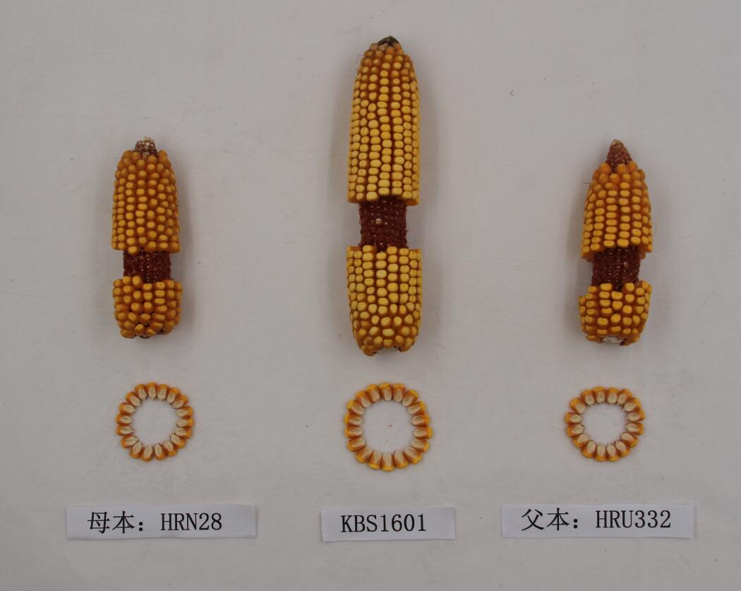 特征特性:东北中熟春玉米机收组,出苗至成熟129.5天,比对照先玉335早熟2.5天。幼苗叶鞘浅紫色,叶片绿色,叶缘绿色,花药浅紫色,颖壳绿色。株型半紧凑,株高283.5厘米,穗位高111.5厘米,成株叶片数20片。果穗长筒型,穗长18厘米,穗行数16-18行,穗粗4.75厘米,穗轴红,籽粒黄色、半马齿,百粒重42.1克。适收期籽粒含水量25.75%,适收期籽粒含水量(≦25点次比例)41.3%,适收期籽粒含水量(≦28点次比例)73.4%,适收期籽粒含水量(≦30点次比例)88.25%,抗倒性(倒伏倒折率之和≦5.0%)达标点比例85.5%,籽粒破碎率为4.45%。接种鉴定,中抗/感大斑病,抗丝黑穗病,感/抗灰斑病,中抗/高抗茎腐病,中抗穗腐病,籽粒容重781克/升,粗蛋白含量11.63%,粗脂肪含量3.78%,粗淀粉含量73.00%,赖氨酸含量0.31%。