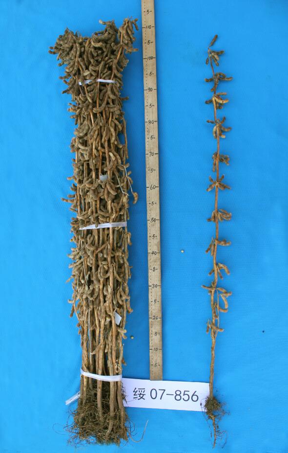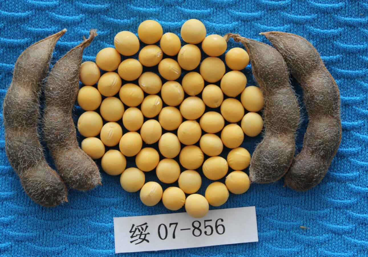 黑龙江省农业科学院绥化分院大豆研究室,以选育适宜黑龙江省第二积温带种植,蛋白质、脂肪含量总和≥60%,产量较对照品种增产≥8%,中抗灰斑病的大豆新品种为育种目标,采用有性杂交,杂种后代按既定的育种目标,系谱法定向选择。2004年以黑农40为母本,以绥农28为父本进行有性杂交,同年冬在海南种F1代,2005年种F2代,同年冬季在海南种植F3代。2006年种植F4代, 2007年种F5代15行,秋天决选2行,其中系统代号为04110-6.7-1-混-1的决选品系号为绥07-856。2008年参加院内鉴定试验,2009年参加院内品种比较试验,2010年参加省预备试验, 2011—2012年参加省区域试验,2013—2014年参加省生产试验。