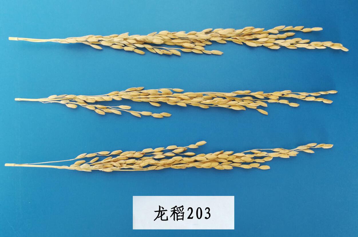 龙稻203水稻品种由黑龙江省农业科学院耕作栽培研究所育成香稻品种,该品种是五优稻4为母本、绥粳4号为父本,系谱法选育而成,2020年通过黑龙江省审定,2020年获得植物新品种权,品种权号:公告号CNA030964E。该品种主茎13片叶,株高93.8厘米左右,穗长19.8米左右,粒型长型,每穗粒数123粒左右,千粒重25.9克左右。