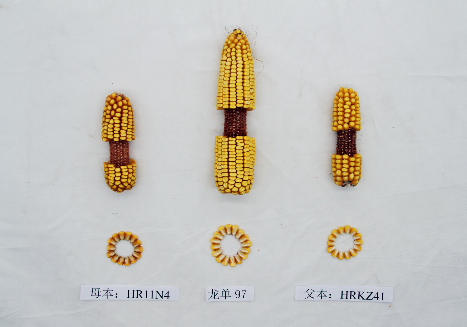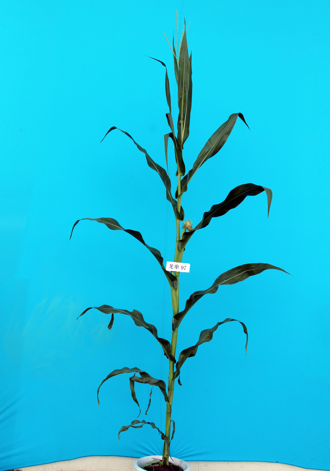 特征特性:龙单97玉米品种。在适应区出苗至成熟生育日数为122天左右,需≥10℃活动积温2650℃左右。该品种幼苗期第一叶鞘紫色,叶片深绿色,茎绿色。株高285厘米,穗位高112厘米,成株可见16片叶。果穗圆锥型,穗轴红色,穗长20.9厘米,穗粗4.9厘米,穗行数14~16行,籽粒马齿型、黄色,百粒重40.6克。两年品质分析结果:容重759~767克/升,粗淀粉72.85%~75.35%,粗蛋白11.52%~11.54%,粗脂肪3.17%~3.78%。三年抗病接种鉴定结果:中感至感(5+~7)大斑病,丝黑穗病:11.1%~23.8%,茎腐病:2.3%~5.6%。