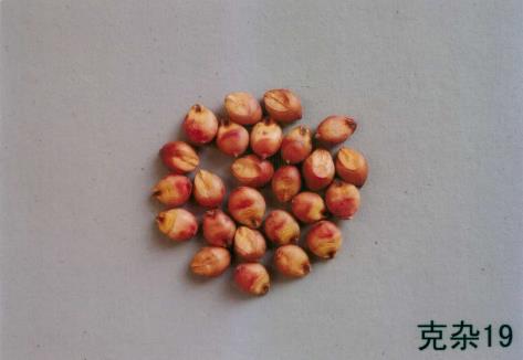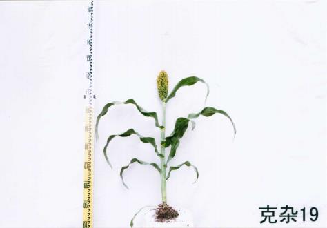 三、特征特性:克杂19号是2014年以KY123A为母本,KHY42为父本杂交测配而成。该杂交种熟期102d,属早熟品种。芽鞘颜色紫色,叶脉颜色黄色,苗期长势强,根孽2个,株高90.0cm,叶片数10片,穗型中紧,穗形纺锤形,穗长20.5cm,套袋自交育性98%,壳色黑,粒色红,穗粒重34.2g,千粒重23.6g,植株整齐度整齐,适口性差。品质分析:总淀粉含量75.73%,粗脂肪含量3.63%,单宁含量1.33%。抗丝黑穗病。适宜在黑龙江省第三、四积温带≥10℃活动积温2100℃以上地区春季种植。