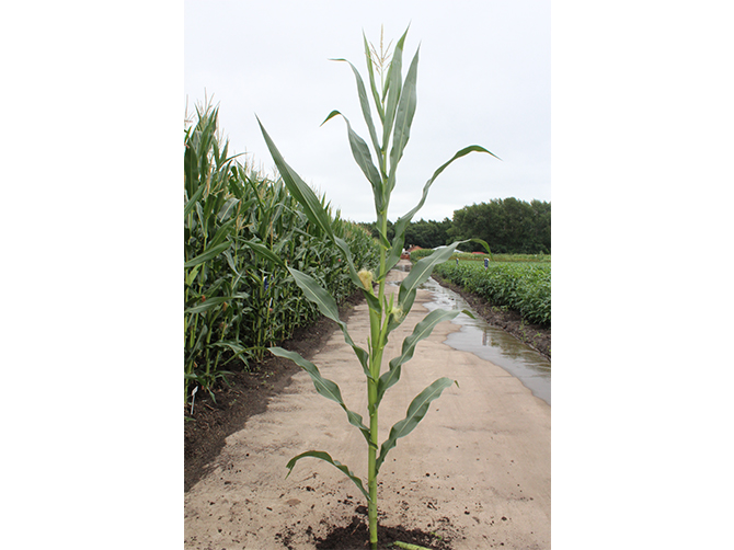 特征特性:绥玉38机收籽粒玉米品种。在适应区出苗至成熟生育日数为117天左右,需≥10℃活动积温2300℃左右。该品种幼苗期第一叶鞘浅紫色,叶片绿色,茎绿色。株高300厘米,穗位高100厘米,成株可见14片叶。果穗锥到筒型,穗轴红色,穗长18.2厘米,穗粗4.7厘米,穗行数14~18行,籽粒马齿型、黄色,百粒重38.1克。两年品质分析结果:容重762~786克/升,粗淀粉74.54%~74.55%,粗蛋白10.72%~11.65%,粗脂肪3.25%~4.19%。两年抗病接种鉴定结果:感至中感大斑病,丝黑穗病发病率16.7%~26.4%,茎腐病发病率1.6%~3.3%。