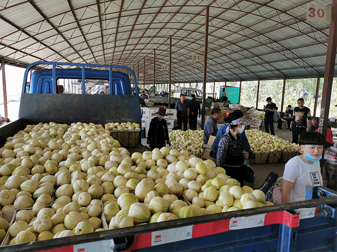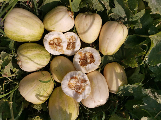 品种简介:成熟瓜倒卵形,瓜皮白色覆黄绿肩,白肉白瓤,平均单果重0.375千克,果实中心糖含量12.0%,果实边糖含量11.4%,口感甜脆,香味浓郁,采收期较集中;田间整体病害程度较轻,对霜霉病及白粉病抗性均强于对照品种。