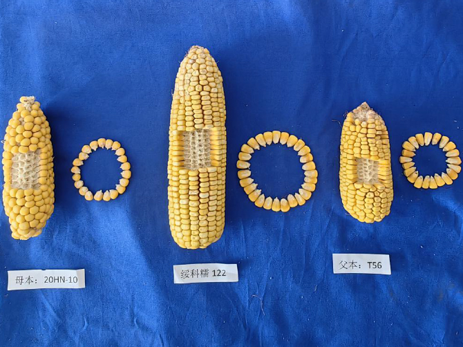 2018 年黑龙江省农业科学院绥化分院杂粮与玉米资源研究 所和黑龙江德兴隆种业有限责任公司利用玉米自交系母本(20HN-10)和玉米自交系父本(T56)组配杂 交组合即20HN-10×T56。2019 年在绥化分院试验地进行初级鉴定和 品种比较试验,该组合综合表现品质突出、综合性状优良。2019~ 2020 年在绥化市望奎、青冈、兰西、庆安等地进行多年多点鉴定试验,平均鲜果穗产量 16989.1 公斤/公顷,比对照品种“金糯262”增产 5.1%。在异地鉴定过程中,该组合在各点均表现果穗鲜食风味佳,植株长势 较强健,抗倒伏,产量高,品质突出适应性好等特点。