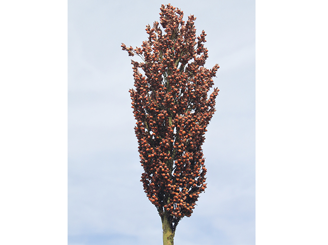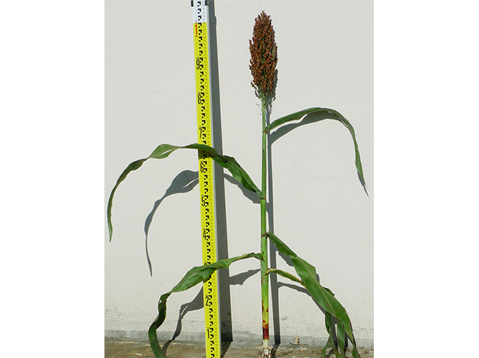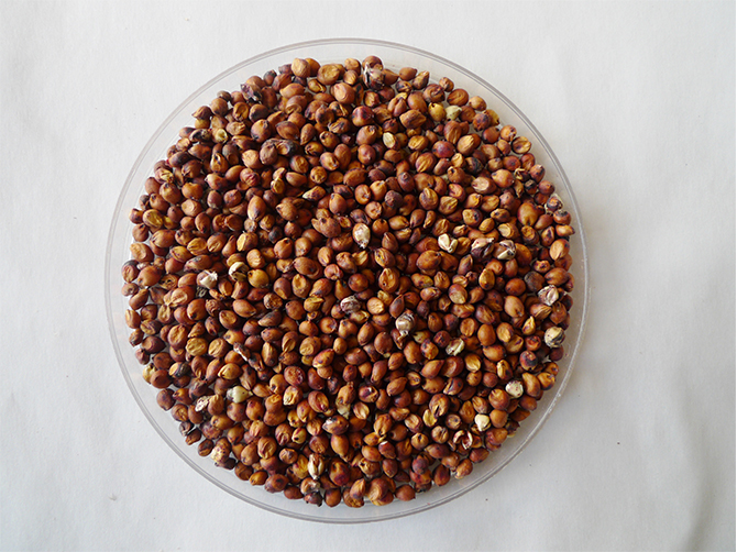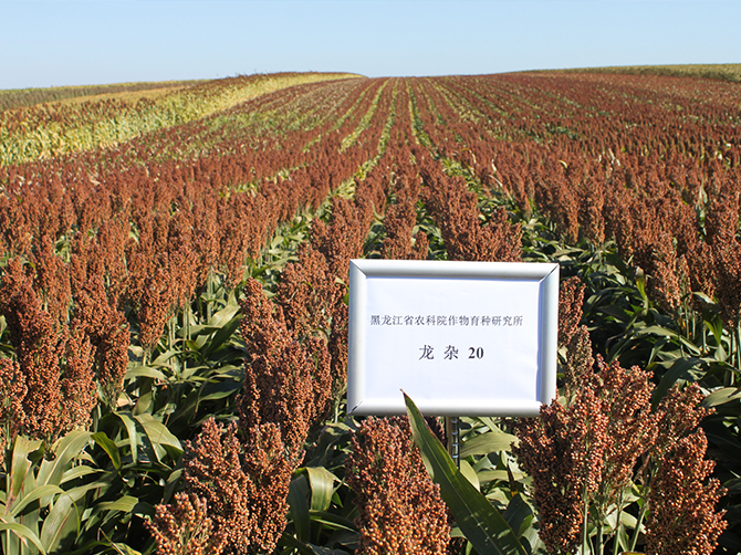 三、特征特性:酿造型杂交种。在适应区出苗至成熟生育日数100天左右,需≥10℃活动积温2080℃左右。幼苗拱土能力强,植株生长健壮,整齐;叶片相对窄小,腊脉,叶色深绿色;株高100厘米,穗长29厘米,纺锤形中散穗;中等红色壳,椭圆形红褐色粒,千粒重26克,单穗粒重29克,着壳率少。自交结实率95%以上。总淀粉含量72.83%,支链淀粉含量86.73%,粗脂肪含量2.81%,单宁含量1.04%。中抗丝黑穗病,叶部病害为2级,中抗蚜虫,中抗螟虫。