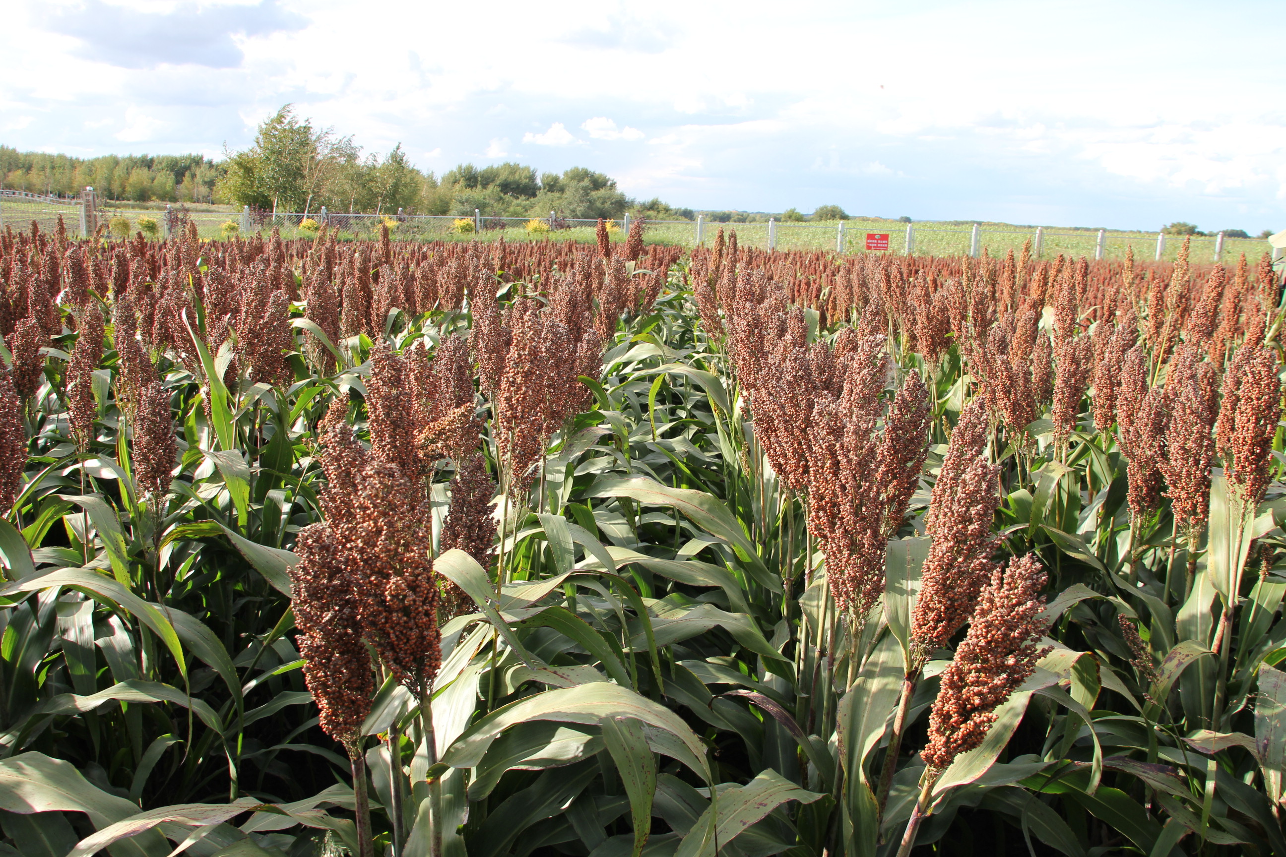 三、特征特性:酿造类型品种。晚熟。熟期117天。杂交种。芽鞘绿色,叶脉蜡色。苗期长势强。根孽0个,株高145.00厘米,叶片数15片,穗中紧,穗纺锤形。穗长30.00厘米,套袋自交育性95.00%,壳红色,粒红色。穗粒重95.50克,千粒重22.00克,植株整齐度整齐,适口性差。适于机械化收获。总淀粉含量76.30%,支链淀粉含量81.30%,粗脂肪含量2.67%,单宁含量1.41%。抗丝黑穗病,2级叶部病害,中抗蚜虫。