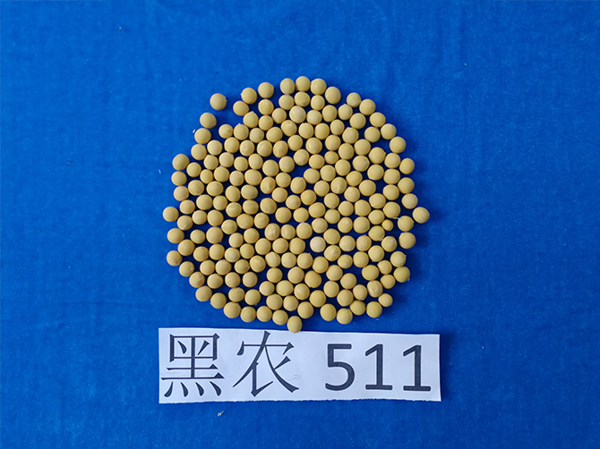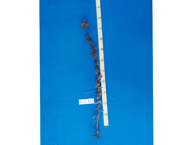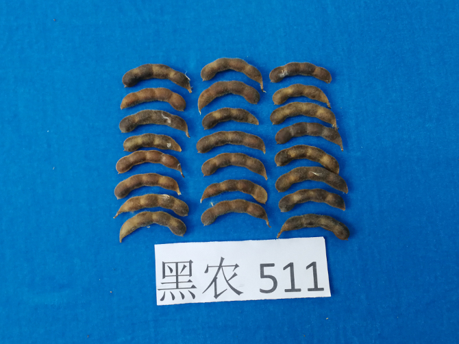 2、特征特性:黒农511高蛋白品种。在适应区出苗至成熟生育日数 120天左右,需≥10℃活动积温 2400℃左右。该品种为亚限结荚习性。株高100厘米左右,无分枝,紫花,尖叶,灰色茸毛,荚弯镰形,成熟时呈黑褐色。子粒圆形,种皮黄色,种脐无色,有光泽,百粒重22克左右。三年平均品质分析结果:蛋白质含量 47.31 %,平均脂肪含量17.35%。三年抗病接种鉴定结果: 中抗大豆灰斑病。
