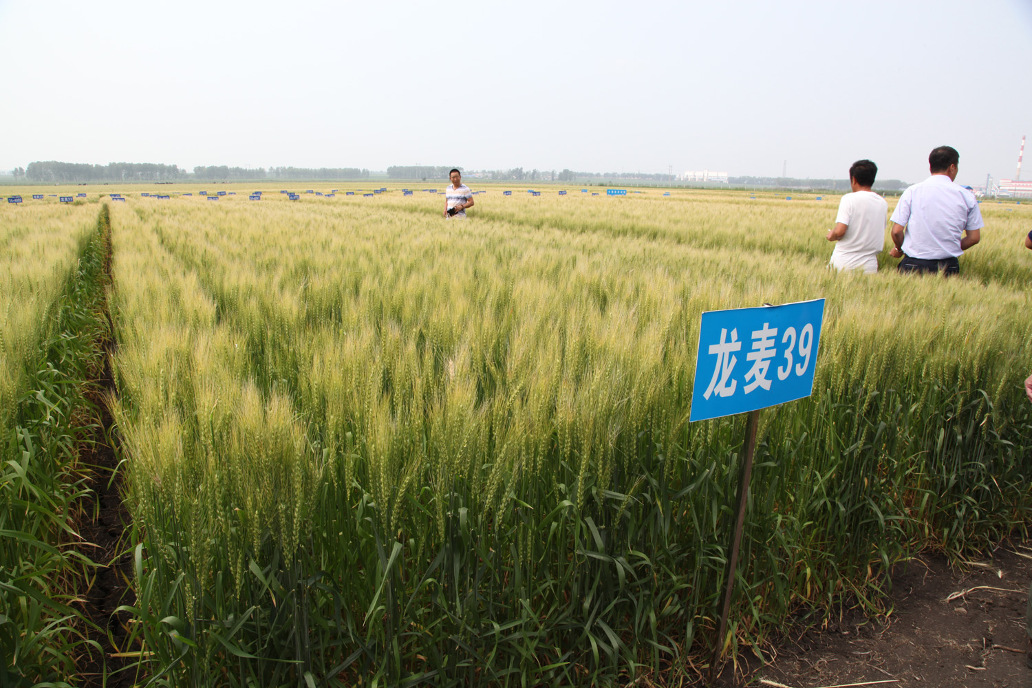 龙麦39由黑龙江省农业科学院作物育种研究所以龙03F3-6519为母本,龙辐20-378为父本,配制杂交组合,后代采用生态派生系谱法选育而成。2015年通过黑龙江省农作物审定委员会审定,审定编号为黑审麦2015003。该品种为强筋小麦品种。适应区出苗至成熟生育日数90天左右。该品种幼苗半匍匐,株型收敛,株高90厘米。穗纺锤型,小穗数一般为18~20个,有芒,千粒重42.0克左右,容重819克/升。三年品质分析结果:蛋白质含量14.8%~16.3%,湿面筋含量32.3%~34.2%,稳定时间17~39.1分钟,抗延阻力625~882Eu,延伸性17.7~18.4厘米。三年抗病接种鉴定:对秆锈病生理小种21C3CTR、21C3CFH、34C2MKK、34MKG等均表现为高抗或免疫,中感赤霉病,中感根腐病。2012~2013年区域试验平均公顷产量4231.5公斤,较对照品种龙麦26增产5.6%;2014年生产试验平均公顷产量4095.1公斤,较对照品种龙麦26增产12.4%。适宜黑龙江省东部麦区种植。