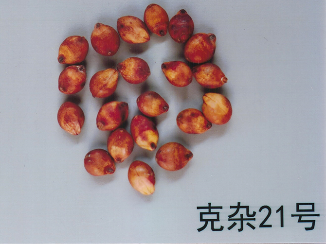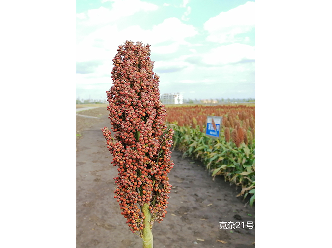 三、特征特性:克杂21号是2016年以KY133A为母本,KHY42为父本杂交测配而成。该杂交种熟期90d,属早熟品种。芽鞘紫色,叶脉黄色。苗期长势强。根孽2个,株高105.00厘米,叶片数8片,穗中散,穗纺锤形。穗长24.80厘米,套袋自交育性98.00%,壳黑色,粒红色。穗粒重33.80克,千粒重24.58克,植株整齐度整齐,适口性差。品质分析:总淀粉含量73.62%,粗脂肪含量3.23%,单宁含量1.48%。抗丝黑穗病。适宜在黑龙江省第四、五积温带≥10℃活动积温1900℃以上地区春季种植。