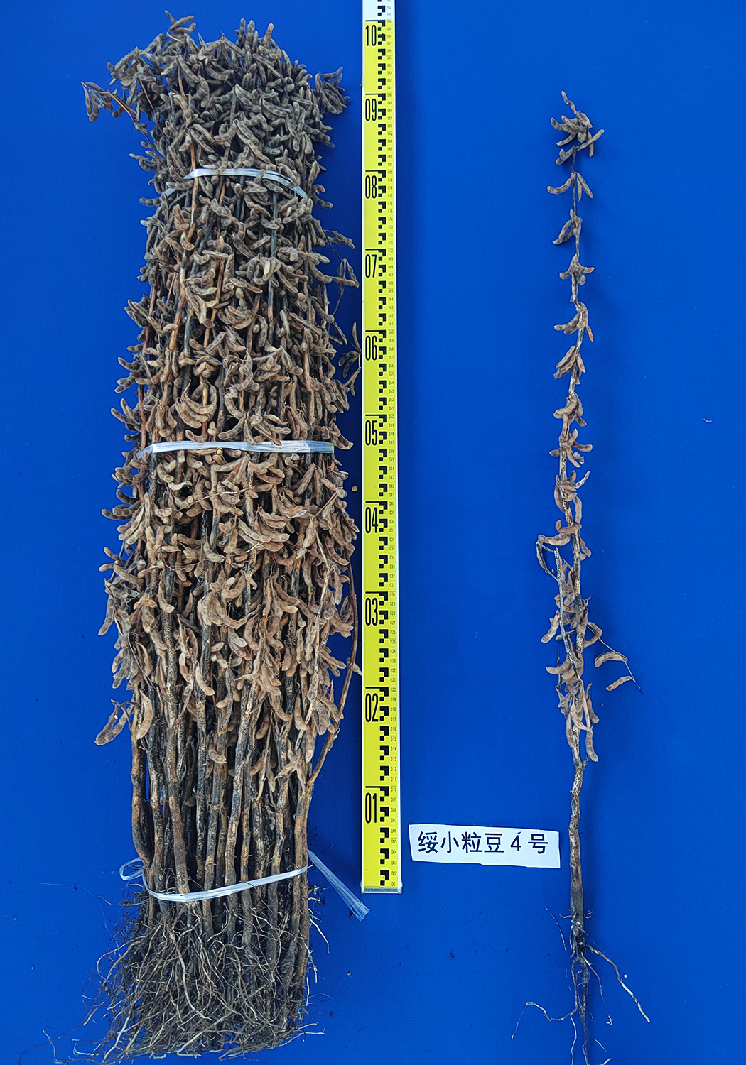 黑龙江省农业科学院绥化分院大豆研究室,以选育适宜黑龙江省第二积温带种植,蛋白质、脂肪含量总和≥60%,产量较对照品种增产≥5%,中抗灰斑病的大豆新品种为育种目标,采用有性杂交,杂种后代按既定的育种目标,系谱法定向选择。2017年以东农 60 为母本,以(东生1号/吉育 109)F1为父本进行有性杂交,同年冬在海南种F代。2018年种F2代,同年冬季在海南种植F3 代。2019 年种F4代。2020年种植F;代,秋天决选品系号为绥,20-5939。2021年在所内鉴定试验及异地鉴定试验。以代号绥小粒豆4号参加 2022 年黑龙江省特用大豆自布点区域试验。2023 年参加省特用大豆自布点生产试验。
