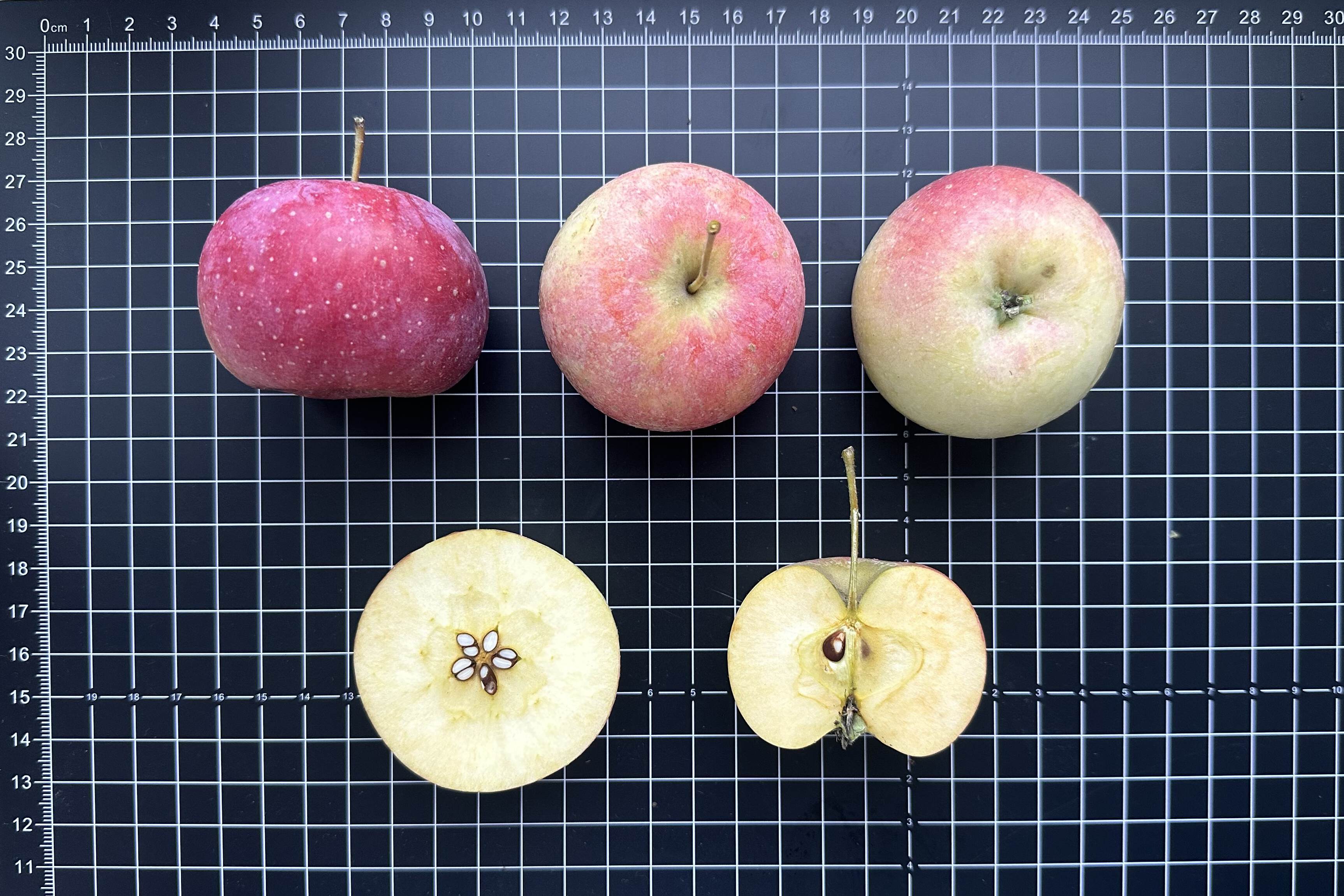 鲜食、加工类型品种。果实成熟期9月下旬。终花期到果实成熟期129天。果实贮藏性120天。树形分枝型,树姿开张,树势中。花蕾粉红,花瓣长圆形,无重瓣,成枝力强。连续结果能力强。生理落果轻,采前落果程度轻。果实扁圆形,果色红色,部分着色,片状。果实成熟时果面有蜡质,有果粉,平滑,无棱起。果点小,密度密,心室占整个果实小。果肉淡黄色,质地硬,汁液中,风味酸甜。香气淡,无异味。果实横径5.16厘米,纵径3.63厘米。可溶性固形物含量14.80%,可滴定酸含量0.51克/一百克,平均单果重52.45克,果肉硬度12.84千克/平方厘米。抗腐烂病,抗黑星病。抗寒。2023-2024年进行适应性试验,第1生长周期亩产1662.49千克,比对照龙丰增产7.69%;第2生长周期亩产1751.30千克,比对照龙丰增产4.18%。