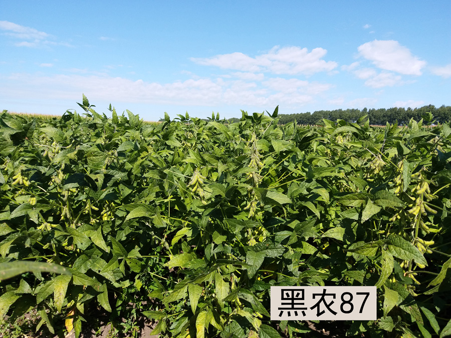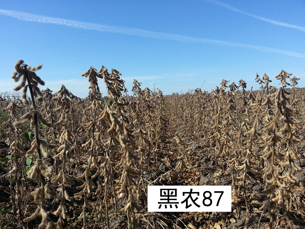 黑农87是黑龙江省农业科学院大豆研究所和黑龙江省农业科学院耕作栽培研究所以合丰50为母本,用60Co-γ射线120Gy处理黑农44的M4为父本进行杂交,采用杂交与辐射相结合的方法选育而成,2017年通过黑龙江省审定,已申请植物新品种保护权。 该品种株高90厘米,紫花,尖叶,灰色茸毛,亚有限结荚习性,子粒圆形,种皮黄色,脐黄色,有光泽,百粒重22克。蛋白质含量36.35%,脂肪含量23.19%。接种鉴定抗病毒病,中抗灰斑病。在适应区出苗至成熟生育日数115天,活动积温2350℃。适宜黑龙江省第二积温带地区种植。该品种2014~2015年区域试验平均公顷产量3054.7公斤,较对照品种合丰50增产6.2%,2016年生产试验平均公顷产量2942.0公斤,较对照品种合丰50增产10.5%,试验最高公顷产量3705.1公斤(笔架山农场2014)。2017年生产示范,富锦示范区 15公顷 实收3720公斤/公顷,黑龙江省农科院民主园区示范田 5亩, 实收亩产273公斤(4095公斤/公顷),有亩产300公斤潜力。