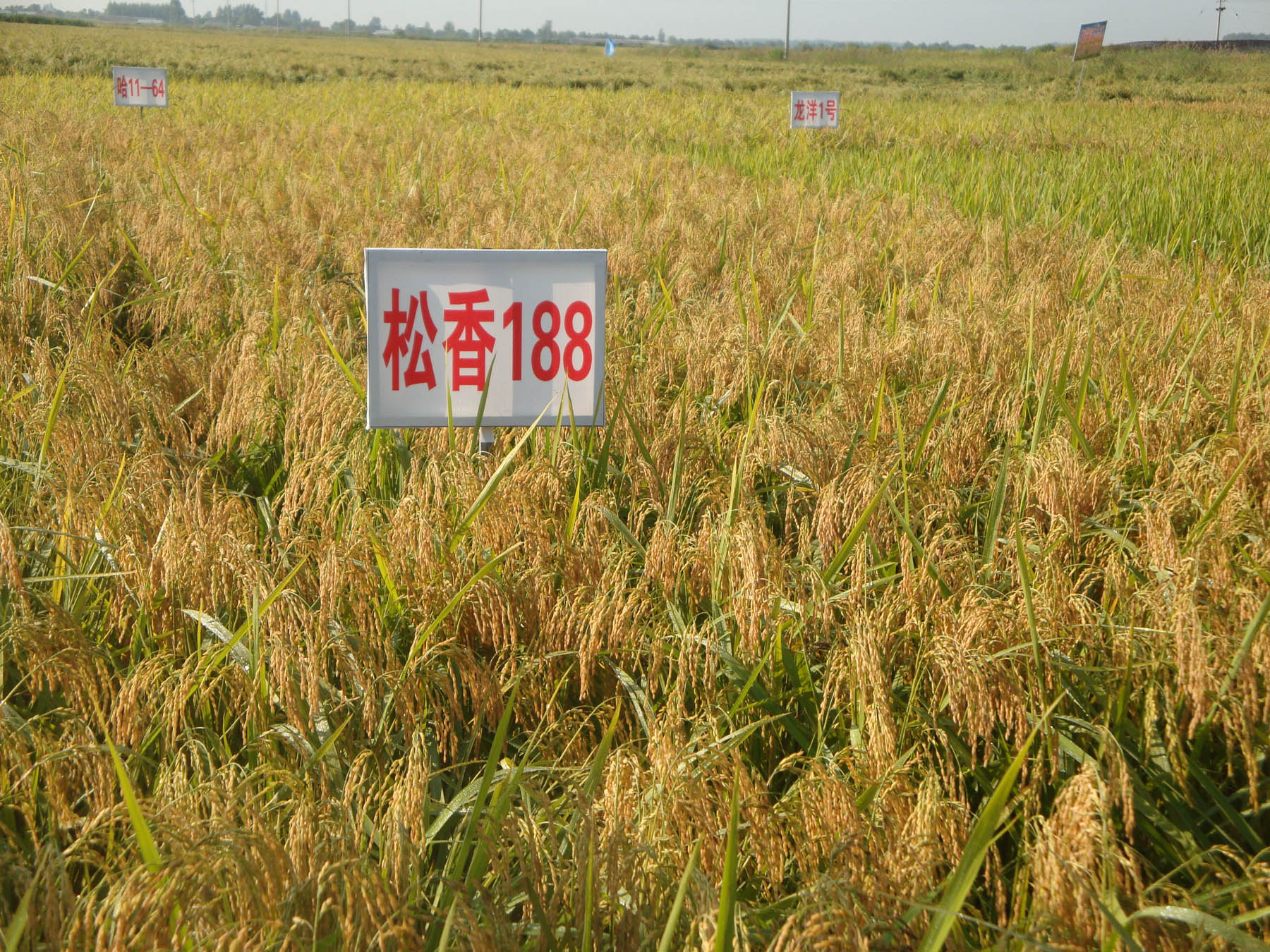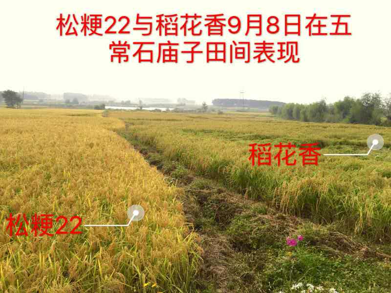 松粳香22品种由黑龙江省农科院五常水稻研究所育成,以香稻五优稻4号为母本,以松02-253为父本进行有性杂交经过多年系谱法选育而成。2016年5月通过黑龙江省农作物品种审定委员会审定。品种权申请号为20151962.3。松粳22全生育日数为146天,参加黑龙江省第一积温区晚熟品种试验,所需所活动积温2750℃左右。该品种株高110cm左右,穗长20.3cm,每穗粒数104粒,千粒重27g, 颖尖杆黄色,株型收敛,叶色褐黄,活秆成熟,秆较强,分蘖力强。米粒细长,外观好,香味较浓,食味好。两年品质分析结果:出糙率80.4%~82.5%,整精米率63.0%~69.5%,垩白粒米率1.0%~7.0%,垩白度0.1%~2.9%,直链淀粉含量(干基)17.33 %~17.84%,胶稠度73.5毫米~81.0毫米,食味品质86~87分,达到国家《优质稻谷》标准二级。三年抗病接种鉴定结果:叶瘟 1~2级,穗颈瘟1~3级。三年耐冷性鉴定结果:处理空壳率11.85%~14.53%。松粳22虽然参加黑龙江省第一积温带晚熟组试验,但该品种后期灌浆速度较快,成熟期比五优稻4号(稻花香2号)早7~10天,抗倒伏能力显著增强,与五优稻4号香味相当,适口性接近五优稻4号,出米率一般比五优稻4号高10%左右,低温年份高达15%以上。在五优稻4号种植区都可种植外,在肇东、肇源、双城、阿城、宁安、宾县、阿城、延寿、泰来、呼兰等五优稻4号的少量种植区,都可大面积种植。这些地区一旦形成高端优质米市场需求,市场对品种的需求潜力巨大。