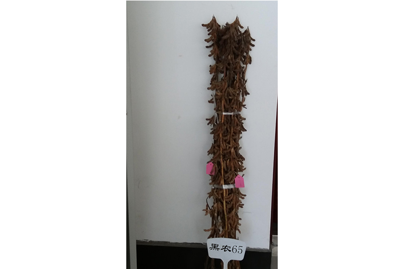 黑农65大豆品种由黑龙江省农业科学院大豆研究所育成,该品种以垦鉴7号为母本,以黑农40为父本,系谱法选育而成。2010年通过黑龙江省审定,20 年获得植物新品种权,该品种株高90cm左右,亚有限结荚习性,尖叶,紫花,四粒荚多,荚熟深褐色,子粒黄色,脐无色,有光泽,百粒重20克左右,蛋白质含量42.1%左右,脂肪含量19.7%左右,2007-2008年区域试验平均产量2119.95公斤/公顷,比对照品种合丰50增产9.1%。2009年生产试验平均产量2699.55公斤/亩,比对照品种合丰50增产13.1%。适宜黑龙江省第一、二积温带和第三积温带上限地区种植,据初步统计,该品种已经推广600多万,主要在富锦、宝清、依安、鹤岗、牡丹江、海林、海伦、吉林、内蒙等地种植。该品种适应性强,丰产性好,品质优良,是典型的食用大豆品种,多年种植,深受农民的欢迎,为满足市场需求,品种培育人保留原种经销权,扩大种植面积。