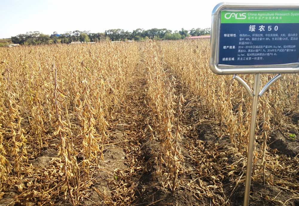 绥农50大豆品种由黑龙江省农业科学院绥化分院以绥农27母本,以(绥农22×绥02-406)F1为父本有性杂交,经六个世代系谱法选育而成,2017年被黑龙江省农作物品种审定委员会审定推广(黑审豆2017002),同年申请植物新品种权,该品种株高85厘米,无限结荚习性,有分枝,紫花,尖叶,灰毛,荚成熟时呈黄褐色。子粒圆形,种皮黄色,种脐黄色,无光泽,百粒重29克左右。生育日数124天,蛋白质含量41.46%,脂肪含量19.88%,中抗灰斑病,田间表现抗叶部病害,注意防治根部病害,秆强抗倒伏。2014~2015两年省区域试验平均公顷产量3295.0公斤,较对照品种黑农53、黑农61增产7.7%;2016年生产试验平均公顷产量2768.6公斤,较对照品种黑农61增产8.4%。适宜黑龙江省第一积温带以及吉林省东部半山区,内蒙古兴盟,新疆昌吉等地区春播种植。
