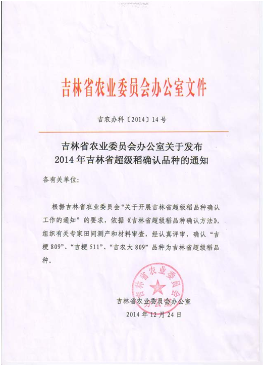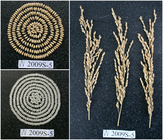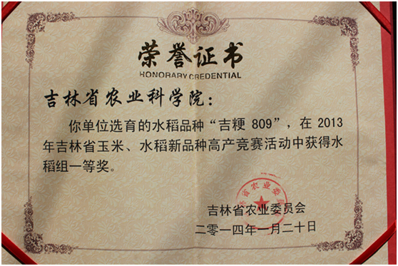 吉粳809由吉林省农业科学院水稻研究所育成,以吉林省优质粳型超级稻品种“”吉粳88“”为轮回亲本,与全球水稻分子育种材料93072为父本,经过杂交与回交构建轮回群体,然后在稻瘟病区自然诱发鉴定选育而成的高产、优质、多抗水稻新品种。于2013年通过吉林省品种委员会审定,审定编号为吉审稻2013020,2014年通过国家品种审定委员会审定,审定编号国审稻2014042。株高111.4厘米,株型紧凑,分蘖力强,叶片上举,茎叶浅绿色,每亩有效穗数23.6万。穗长19.8厘米,略半弯穗型,平均穗粒数129.2粒,结实率82.9%。谷粒椭圆形,颖及颖尖黄色,无芒,千粒重23.5克。依据农业部NY/T593-2002《食用稻品种品质》标准,糙米率84.6%、精米率75.8%、整精米率73.4%、粒长5.0mm、长宽比1.8、垩白粒率19%、垩白度2.7%、透明度1级、碱消值5.5级、胶稠度80mm、直链淀粉含量17.8%、蛋白质含量7.2%。米质符合二等食用粳稻品种品质规定要求。2010-2012年采用苗期分菌系人工接种、成株期病区多点异地自然诱发鉴定,结果表明对苗瘟表现抗,叶瘟表现中抗,穗瘟表现中抗。2010-2012年,在22个抗纹枯病田间自然诱发有效鉴定点中,最高病级7级,表现中感。晚熟品种。生育期145天,需≥10℃积温2950℃左右。2011年区域试验平均公顷产量8771.7公斤,比对照品种秋光增产4.8%,2012年区域试验平均公顷产量8955.0公斤,比对照品种秋光增产7.2%;两年区域试验平均公顷产量8863.4公斤,比对照品种秋光增产6.0%。2012年生产试验平均公顷产量8516.4公斤,比对照品种秋光增产3.1%。适宜吉林省四平、通化、吉林、长春、松原等晚熟稻区种植。